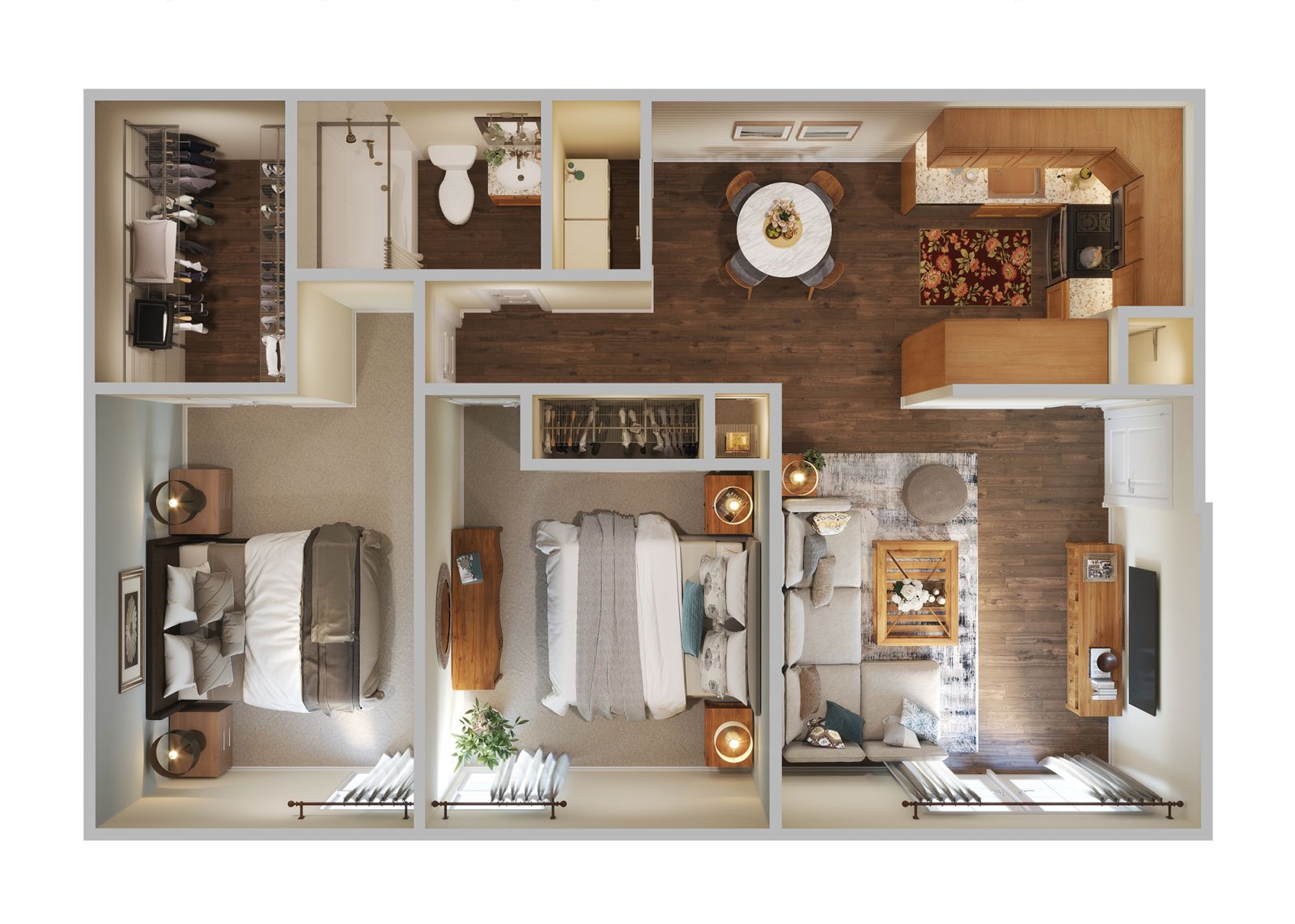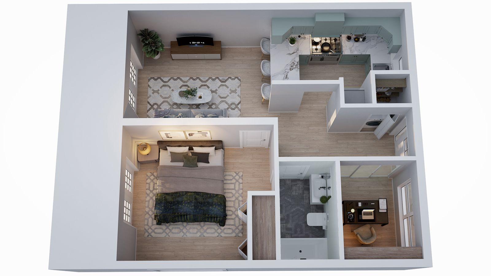 CAV Studio pays attention to these nuances. For family-oriented projects, we may emphasize storage, children’s rooms, and flexible spaces for study or play. For luxury segments, we might highlight generous master suites, walk-in closets, and connections to views and terraces. For investor-focused campaigns, we can create clean layouts that show efficient use of space and clear separation between private and social zones.